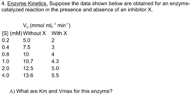 Solved Enzyme Kinetics Suppose The Data Shown Below Are Obtained For An Enzyme Catalyzed Reaction In The Presence And Absence Of An Inhibitor X Vo Mmol Ml Min S Mm Without X